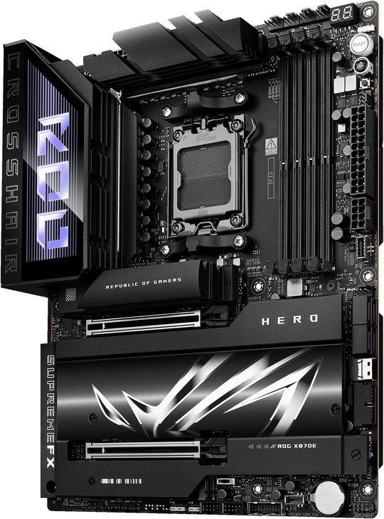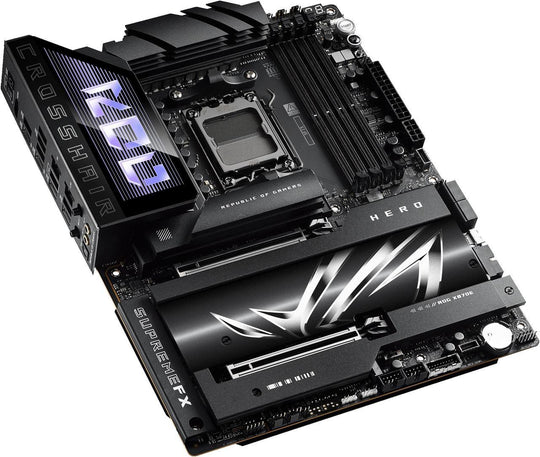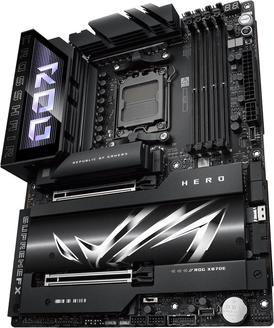 Sold out                  Vendor: Asus ASUS ROG CROSSHAIR X870E HERO AMD X870E AM5 ATX motherboard, Advanced AI PC ready, DDR5 The ASUS ROG Crosshair X870E Hero is a cutting-edge ATX motherboard designed to harness the full potential of AMD's latest AM5 platform, offering an exceptional foundation for high-performance gaming, content creation, and overclocking. Featuring the AMD...Regular price $669.99Regular price $669.99