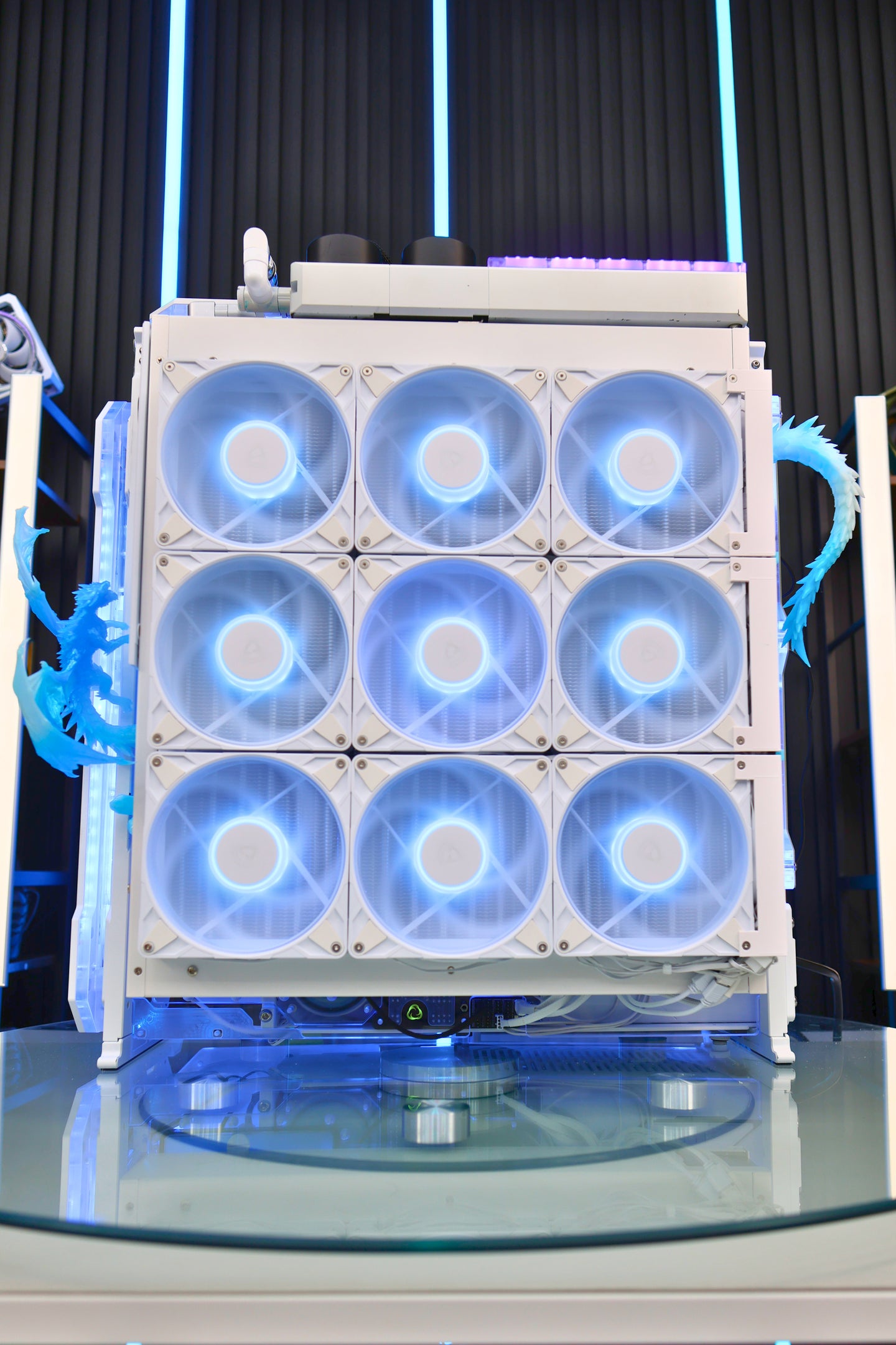 This build features a fully custom, professional-grade liquid cooling system centered around the massive MO-RA3 400 external radiator, paired with multiple D5 pumps and a premium reservoir setup. The result is incredible thermal performance with whisper-quiet operation, even under the heaviest loads. High-end fittings, precision tubing, and premium coolant complete the loop, making it as visually striking as it is effective.